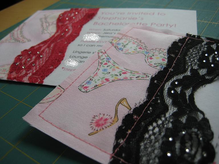 Below are the supplies I used to make the cards. After printing the invite details on the right side of the card stock, I fussy-cut the fabric to ensure each card has a lingerie print on it, and then cut a strip of lace. (so cute!)