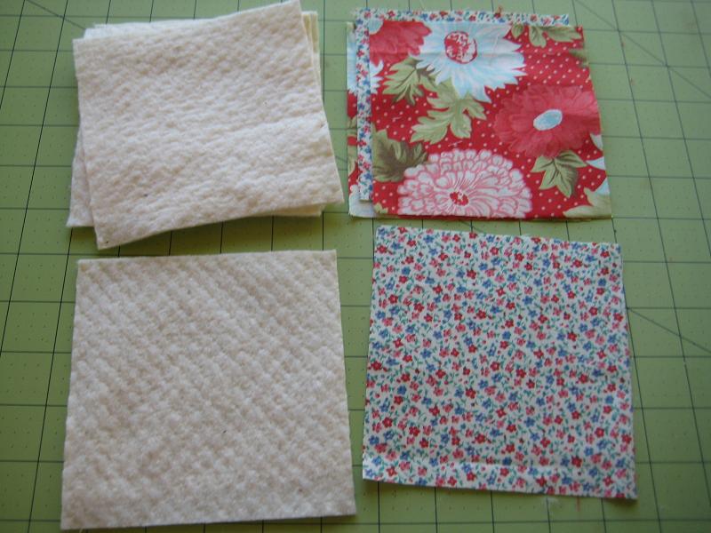 Step 2 β From your scrap fabrics, cut four 5β squares for the coaster backing. From your scrap batting, cut four 5β squares.