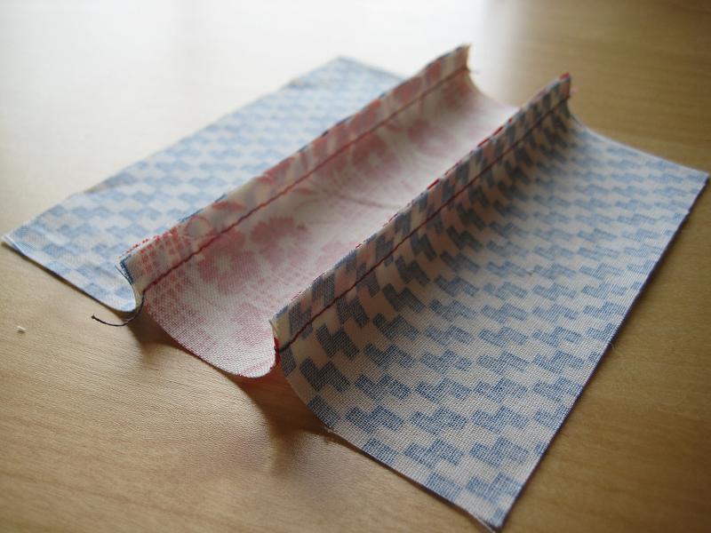 Step 3 β Take a pile of three rectangles (from step 1) and piece them together: With right sides facing together, sew a ΒΌβ seam along the length. The back will look like the first picture below. Press flat with an iron.