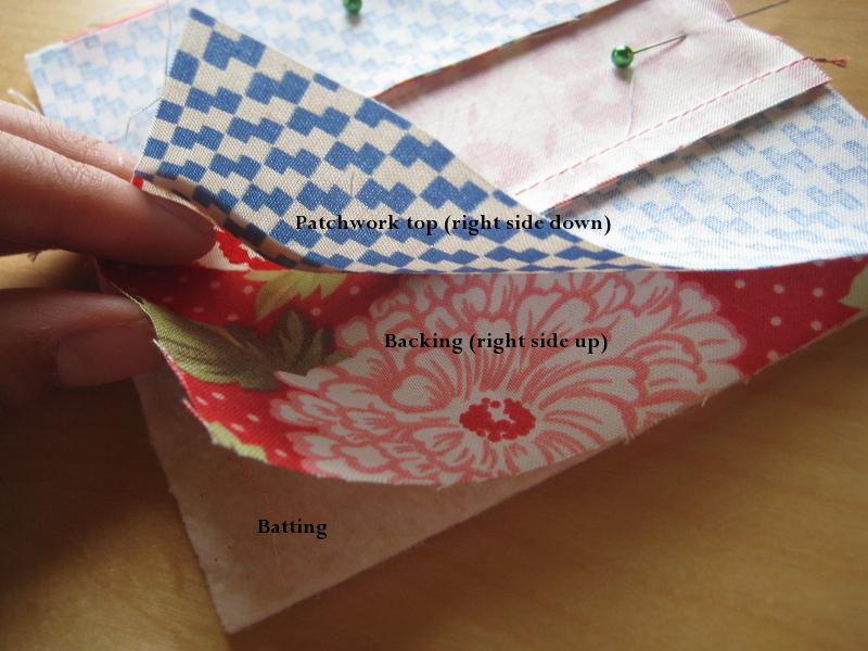 Step 4 β Take the patchwork top, backing and batting and layer them in that order. The right sides of the patchwork top and backing should be facing each other. Make sure everything is aligned, and then pin to keep in place.