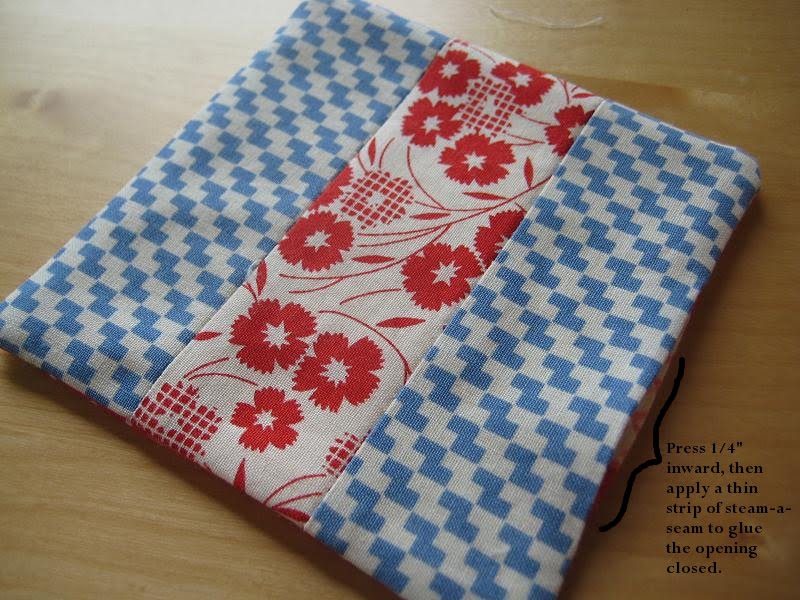 Step 6 β Through the 2β opening, turn inside out so that the batting is sandwiched in between the patchwork top and backing fabric. To seal the opening, fold the opening inward ΒΌβ, press with an iron, and then apply a thin strip of steam-a-seam to glue it closed.
