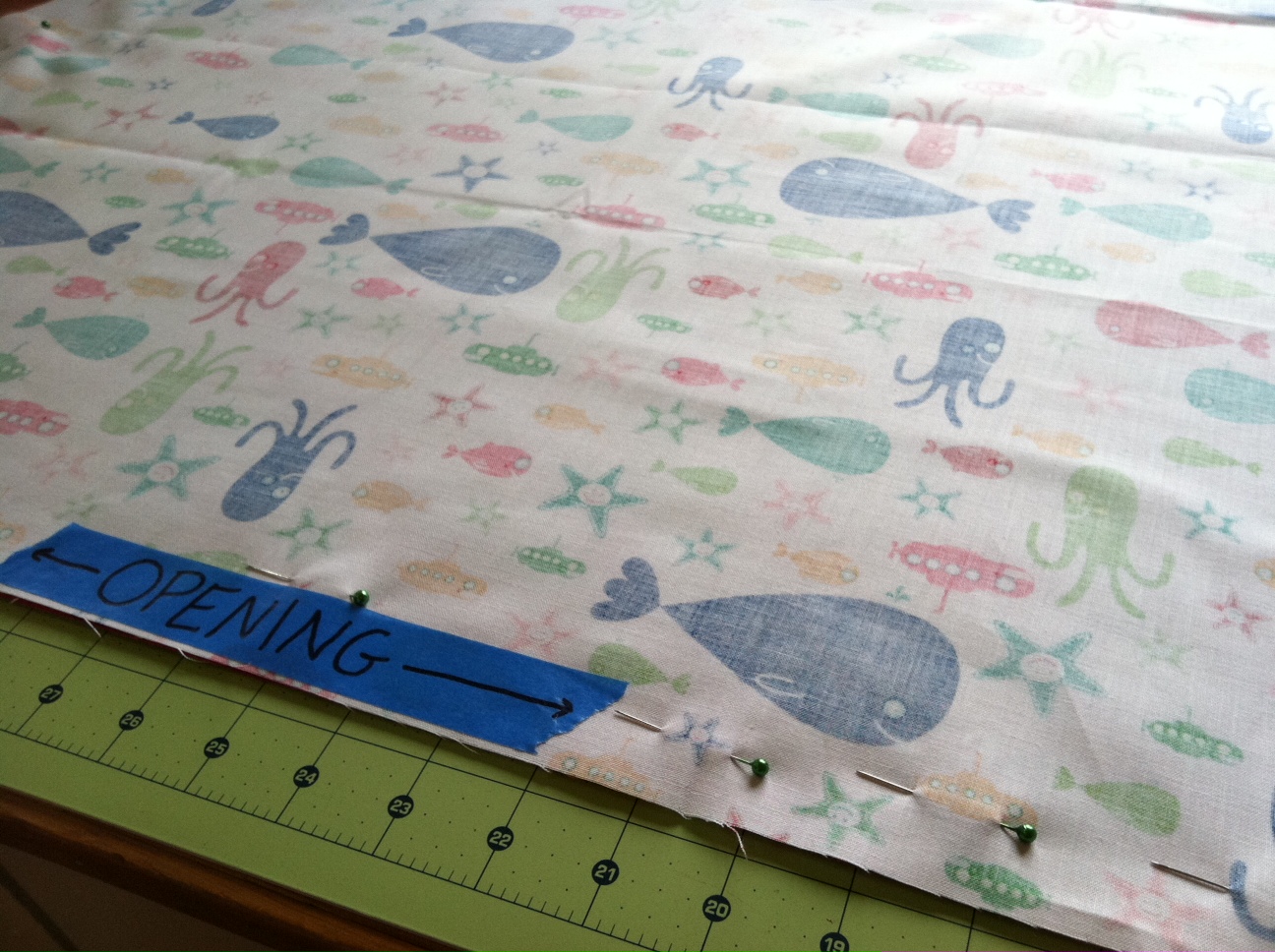 Pin to keep in place. As shown below, mark an opening (I used tape) away from the corners that’s at least 7 inches long.