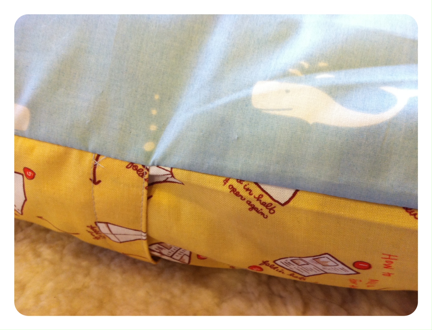 Anyway, here’s the back of the pillow. You can find it at my shop sold in a bundle, here. It’s adorable; The print are instructions on how to fold a paper hat. 🙂