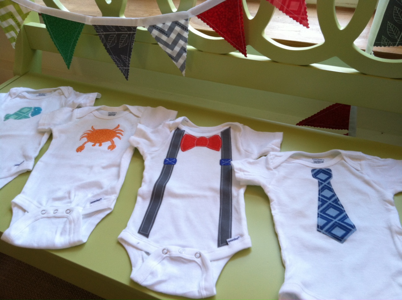 I made the pennant banner by loosely following my old pennant banner tutorial which can be found here. If you’re digging the fabric choice for both the bibs and banner, I mainly used the Simply Color collection by V and Co for Moda.