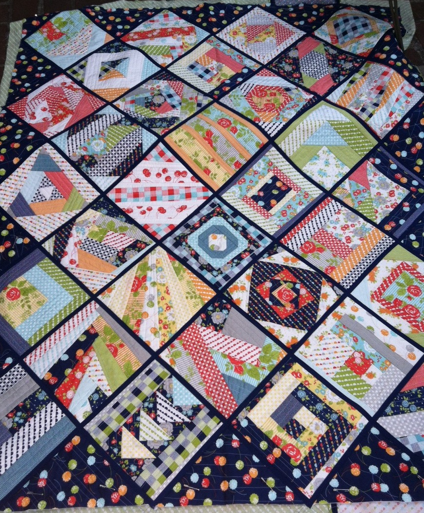 I love how you pulled together the sampler blocks with Navy sashing and the bold polka dot print 🙂 Great idea!