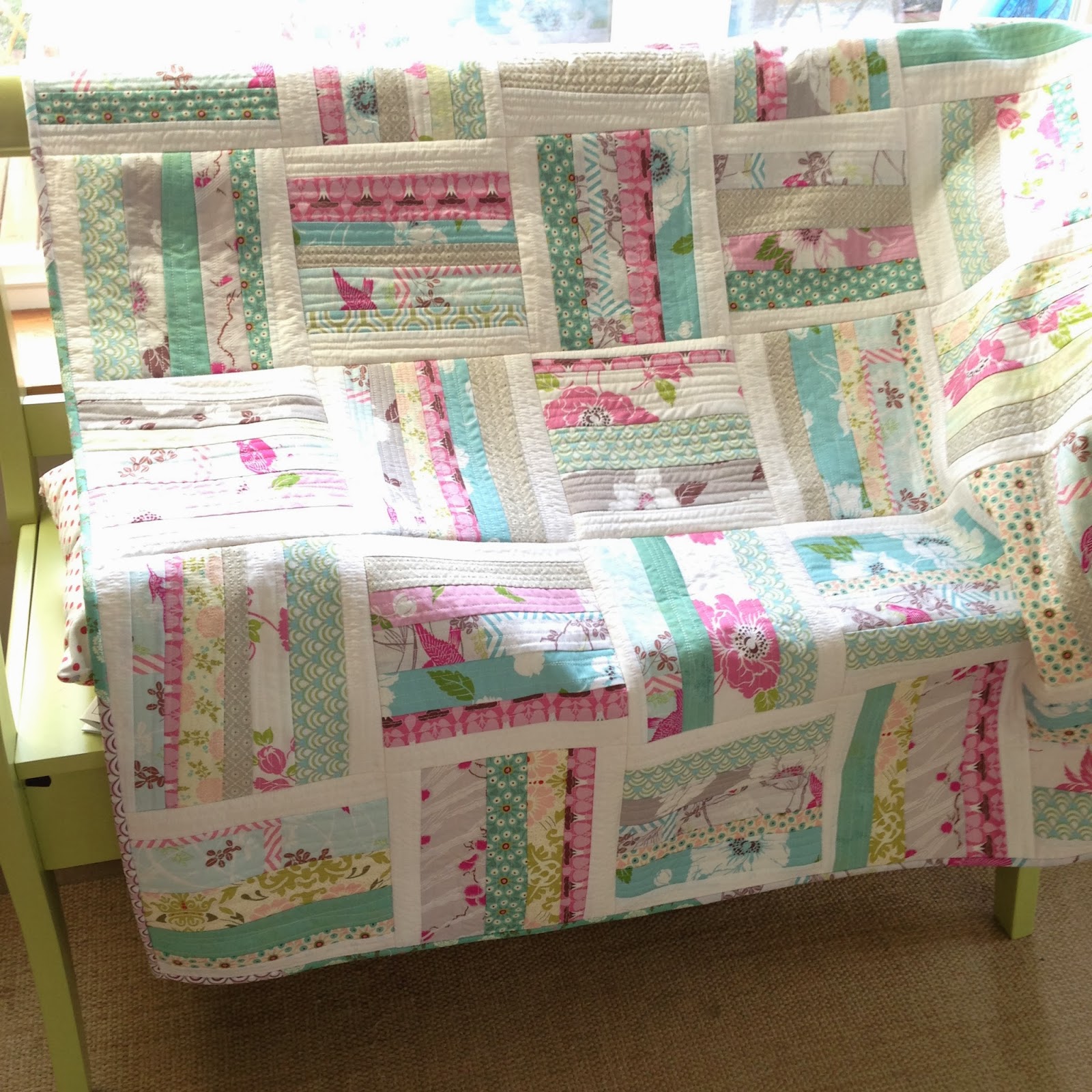 This quilt measures approximately 45″ x 54.” It makes a good size throw quilt, wall-hanging quilt or baby quilt. I made it with top quality, designer 100% cotton fabrics with a cozy Quilters Flannel for the backing. It’s a sturdy and warm quilt! 🙂
